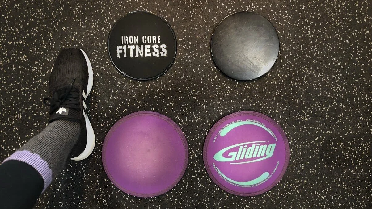 Sliders / Gliders are another great piece of equipment to keep in your bag. They are versatile, but I tend to mainly use them for core exercises. Depending on the space you have access to, the type of slider / glider you purchase will make a difference. I have 2 types (as seen below); the purple “Gliding” slider, is left at our studio and the black “Iron Core Fitness” slider travels with me.